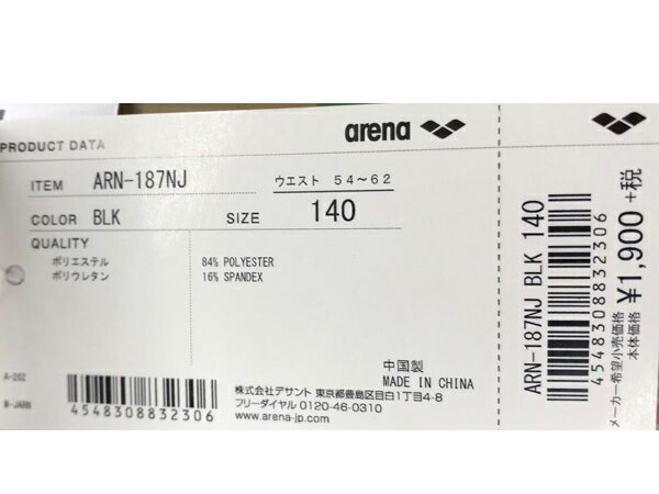 【あす楽/ネコポス対応可】ジュニア120・130サイズ!ARN-187NJ arena アリーナ スクール水着 ジュニア男子 子供用 スパッツ キッズ プール 水泳 BKBU